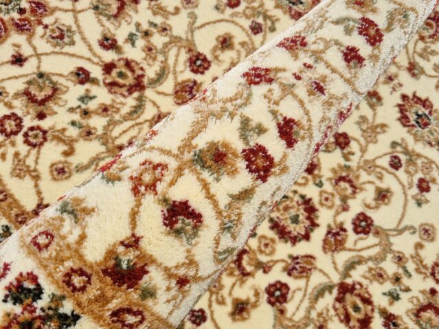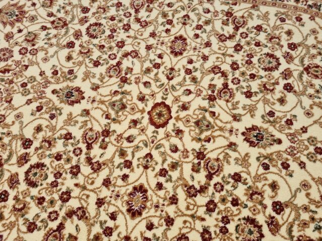 Piękny dywan o orientalnym i tureckim wzornictwie! Jego unikatowa kolorystyka dodaje mu niezwykłej dekoracyjności. Te dywany urzekają bogatym zdobieniem w postaci kwiatowych motywów i ornamentów. Są też miękkie i gęste, co sprawia, że doskonale komponują się z klasycznym wystrojem wnętrz, zwłaszcza z solidnymi meblami drewnianymi. Ten konkretny turecki dywan został wykonany z wykorzystaniem techniki HeatSet. Do produkcji użyto wysokiej jakości przędzy polipropylenowej, którą poddano termicznej stabilizacji. Dzięki temu jest niezwykle miękki w dotyku, a jego runo jest gęste, przypominając wełniany dywan. Dodatkowo, posiada właściwości antyelektrostatyczne, izolujące termicznie i akustycznie. Łatwy w utrzymaniu czystości – można go odkurzać i prać specjalnymi szamponami dedykowanymi do dywanów. To wyjątkowy dywan, który zachowuje wysoką wytrzymałość, trwałość i odporność na zagniecenia, pozostając piękną ozdobą Twojego pokoju przez wiele lat.